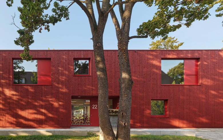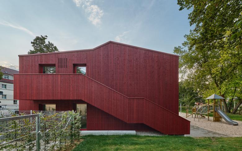 In Nachbarschaft zum Kulturpark Berg im Stuttgarter Osten liegt das Grundstück der KiTa Parkstraße. Der zweigeschossige Neubau der viergruppigen Kindertageseinrichtung fügt sich in den Grünzug mit historischen Baumbestand an der Stelle des Vorgängerbaus ein. Position, Gebäudeabmessung, Konstruktion und Materialität der KiTa leiten sich aus den besonderen Parametern des Grundstückes ab: Die Ortsbausatzung definiert die Gebäudetiefe von zwölf Metern. Position und Ausrichtung ergeben sich aus der Baulinie und dem von Westen nach Osten abfallenden Gelände. Die Gründung auf einer bestehenden Bunkeranlage im Untergrund macht einen Leichtbau aus Holz alternativlos.