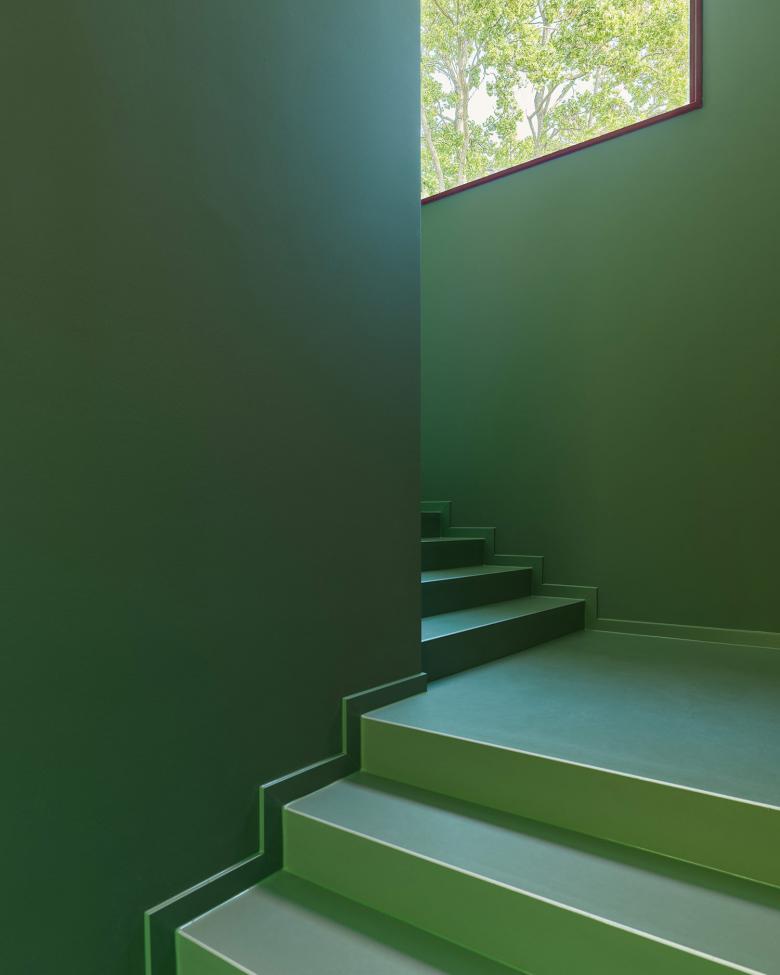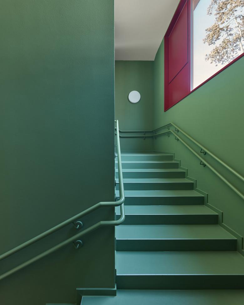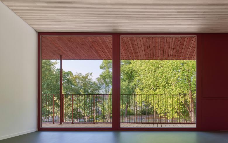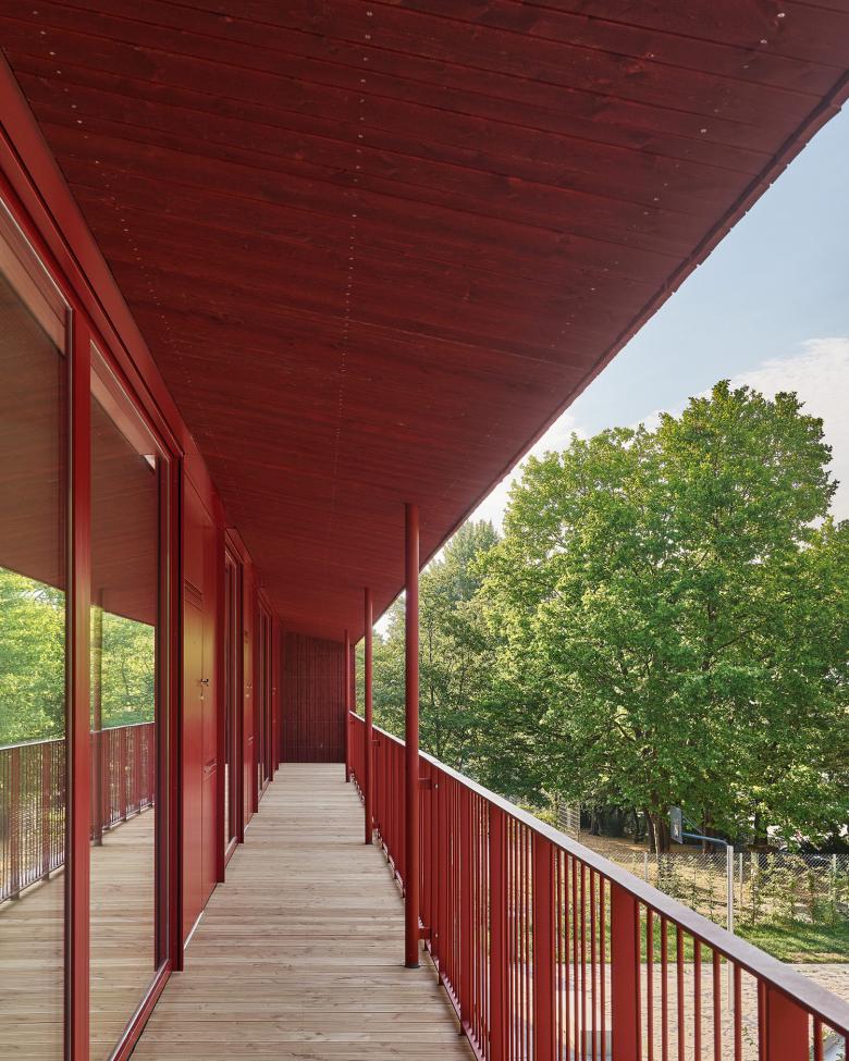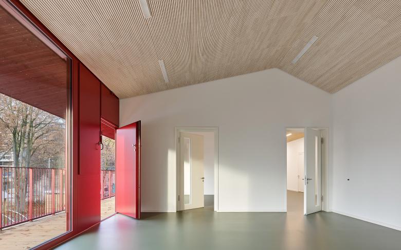Der Haupteingang befindet sich auf der Nordseite und ist in der Fassade gut ablesbar. Das Foyer, das auch als Elterntreff dient, ist von Norden nach Süden durchgesteckt und öffnet sich zur Gartenseite. Von hier aus wird der Mehrzweckraum erschlossen sowie über einen Flur die Gruppenbereiche im Süden und die Nebenräume im Norden. Allen Aufenthaltsräumen im Obergeschoss ist eine Loggia vorgelagert. Zwei Außentreppen, die sich plastisch vom Baukörper abheben, führen auf direktem Weg vom OG in den Garten mit Freispielflächen.