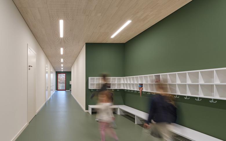 Die klare Gliederung des Baukörpers in eine Gruppen- und eine Nebenraumzone ist in der Ausbildung der Fassaden sowie der Dachform ablesbar. Oberlichter im Dach entlang des Flurs unterstützen den Eindruck und ermöglichen eine gute Belichtung und Belüftung des Gebäudes. Durch die innere Gliederung des Gebäudes können Sanitär- und Lüftungsinstallation auf die Nebenraumspange beschränkt werden. Hierdurch lassen sich in den Aufenthaltsräumen größere Raumhöhen realisieren und Deckenabhängungen einsparen.