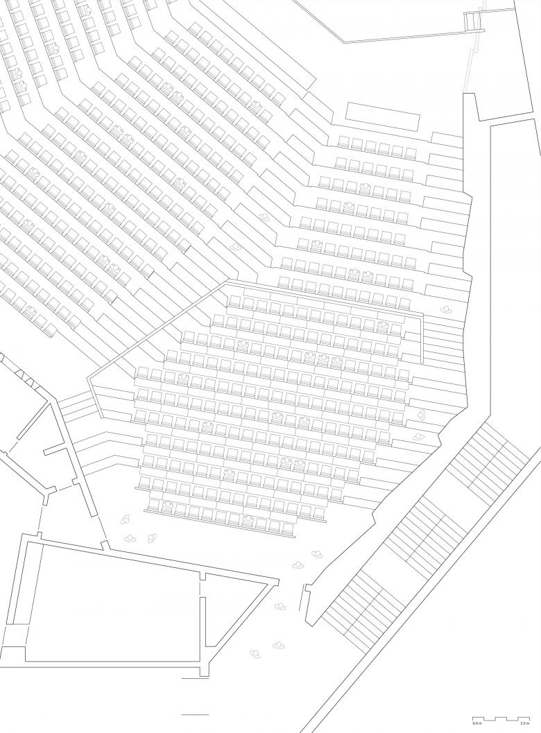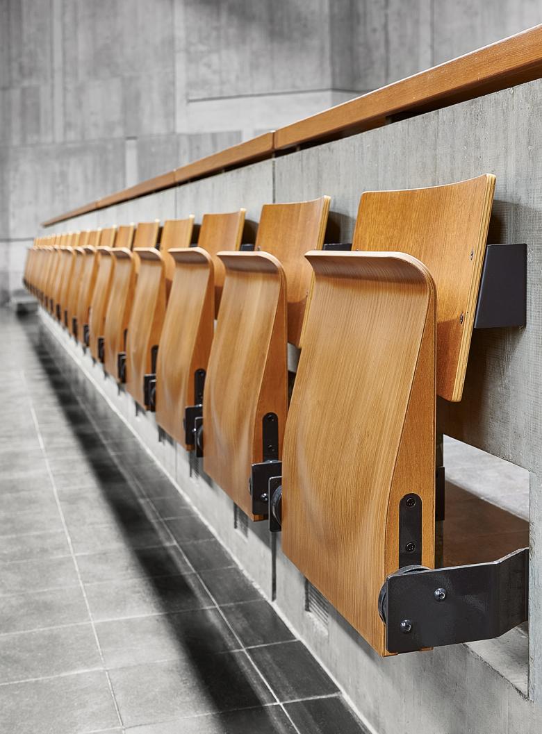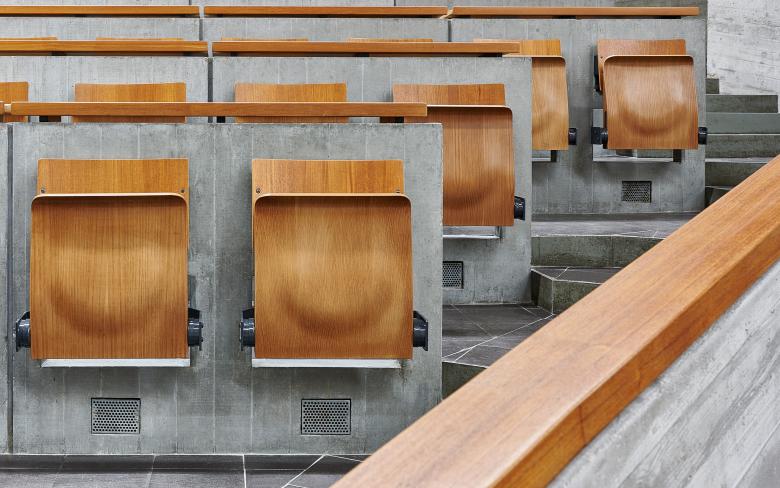 Teile des Hörsaalgestühls wurden erneuert, Hörsaaltische restauriert sowie ein barrierefreier Zugang zu den Hörsaalpodien geschaffen. Die Sanitäranlagen für Besucher/ innen wurden grundlegend überplant und mit zusätzlichen Raumfunktionen wie Wickel- und Putzräumen an die aktuellen Nutzervorgaben angepasst. Die Erneuerung der Echtholz-furnierten Klappsitze mit neuer Mechanik sowie die restauratorische Überarbeitung der Tische mit Teakholzfurnier in Audimax erfolgte in enger Abstimmung und nach Vorgaben der unteren Denkmalschutzbehörde. Bestehende Betonflächen wurden dabei lediglich gereinigt, um die originäre Sichtbetonoptik zu erhalten. Um Referenten eine barrierefreie Zuwegung zu den Hörsaalpodien zu ermöglichen, musste eine rollstuhlgerechte Aufzugsanlage, WCs für die Referenten sowie alle Bereiche des Podienzugangs barrierefrei ertüchtigt werden. Vorhandene Flurabschlüsse wurden im Zuge der Maßnahme brandschutztechnisch ertüchtigt bzw. durch neue Brandschutztüren ersetzt. Hierzu wurde in Zusammenarbeit mit einem Künstler ein Konzept entwickelt, das einerseits eine bessere Orientierung und Auffindbarkeit der Podienzugänge unterstützt und andererseits die unterirdischen Erschließungswege durch die Implementation von künstlerischen Elementen angemessen aufwertet.