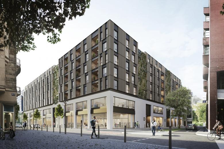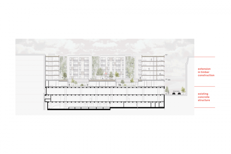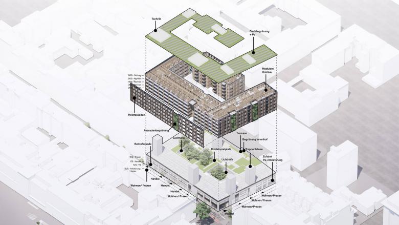 Der Umbau des früheren Galeria Kaufhofs in der Mannheimer Innenstadt ist ein herausragendes Beispiel für innerstädtische Transformation und nachhaltige Nachverdichtung: Werden die unteren Geschosse zu maximal flexiblen Büro- und Handelsflächen umgebaut, entsteht vom 2. OG bis zum 6. OG neuer, teilweise als Holzbau ausgeführter, urbaner Wohnraum in Holz-Hybridbauweise.