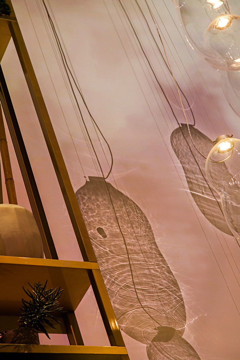 Quasi als »Stadtgarten« inszenierten die Gestalter das Entree, die Visitenkarte des Hotels. Der Gast erlebt die über drei Stockwerke geöffnete Empfangshalle als sehr großzügig, modern und urban. Fast raumhohe, üppig begrünte Regale und bis zu ein Meter hohe, mundgeblasene Glasleuchten verleihen dem Raum eine Aura der Leichtigkeit und Wohnlichkeit.