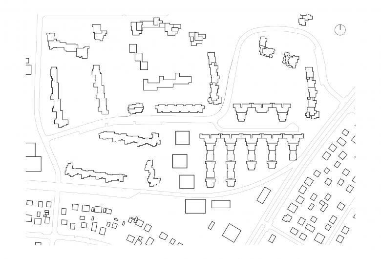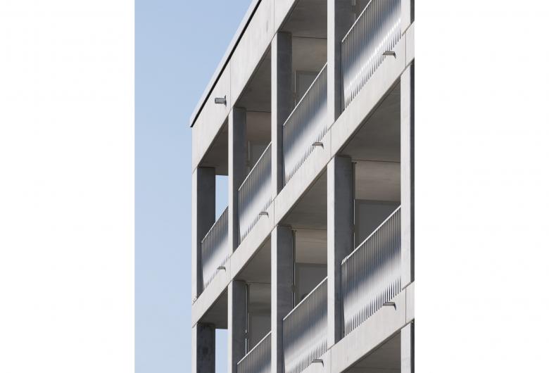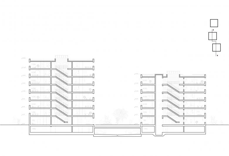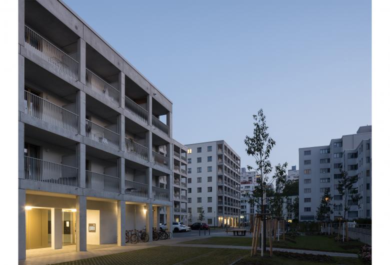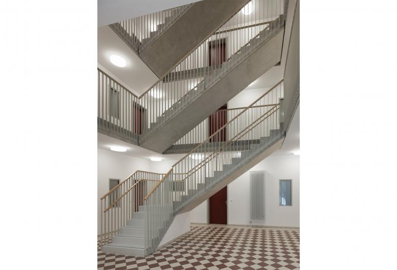 der Natur fort, die sanft um die Baukörper herum fließt. Die zentral eingesetzten Treppenhäuser laden mit ihrem offenen, lichten Patio-Charakter zu nachbarschaftlichen Begegnungen ein.