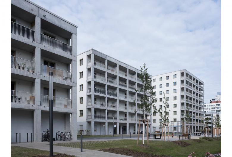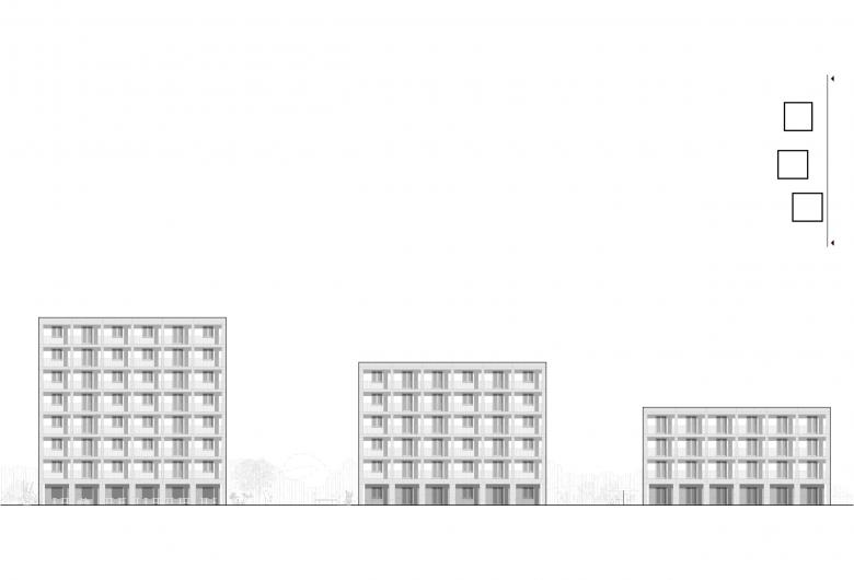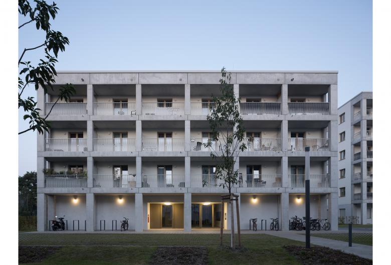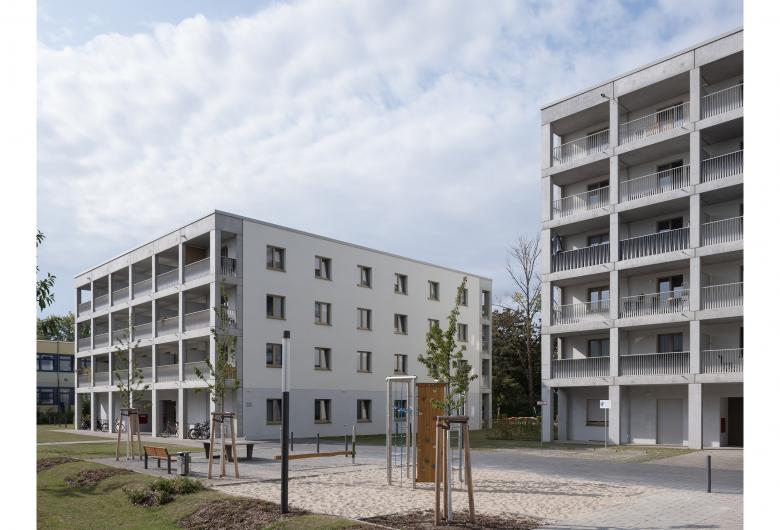 In einem heterogen bebauten Gebiet in der südlichen Gropiusstadt verwirklichten BFA mit BSL zeitgemäßes, offenes Wohnen. Drei herrschaftliche Kuben reihen sich wie Perlen an einer Kette aneinander und staffeln sich von Norden nach Süden ab. An zwei Seiten sind alle Häuser mit einem Balkonregal verkleidet, das mit bis zu 10 Meter langen Balkonen viel nutzbaren Außenraum bietet. Die Relevanz des Außen setzt sich in den umgebenden Gemeinschaftsplätzen und
