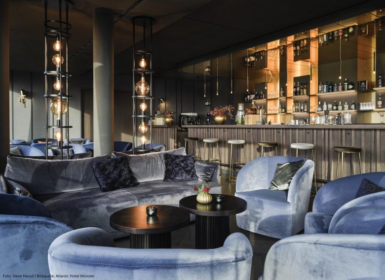 Die 224 Zimmer und Suiten überzeugen mit allen Annehmlichkeiten zeitgenössischen 4-Sterne-Superior-Komforts: Edles Parkett, Naturmaterialien und Farbharmonien aus Erdtönen und Neutrals machen sie zu warmen, relaxten Refugien. Im Dachgeschoss bietet das Hotel neben dem 380 qm großen „Engelsaal“ mit neuester Eventtechnik ein weiteres spektakuläres Highlight: Die ATLANTIC Skybar. Inszeniert in einem eleganten Ambiente aus dunkelblauem Samt und schimmernden Messingdetails. Eine Attraktion, die nicht nur auswärtige Gäste, sondern auch die Münsteraner*innen selbst begeistert, und in kürzester Zeit zur neuen In-Location der Stadt avanciert ist.
