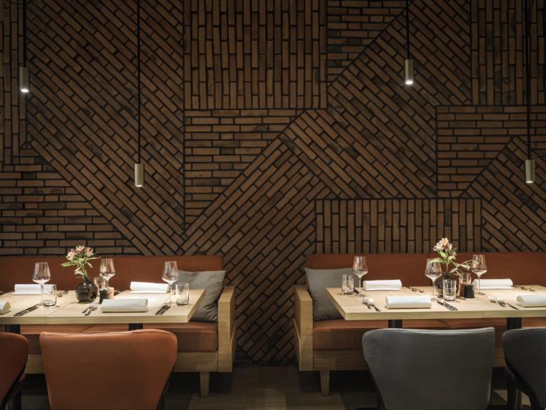 Der besondere Zauber des Standorts inspirierte OlufemiMoser zu einem eleganten, modernen Interior Konzept, das klassisch westfälische Zitate und vibrierende Urbanität zu einem eklektischen Stilmix verbindet. So diente die typische Diele westfälischer Höfe als Zitatgeber für das große, offene Erdgeschoss: Filigrane Holzkonstruktionen, die an Ständerwerk erinnern, untergliedern den Raum in funktionale Zonen; und der offene Grill im Frontcooking-Restaurant des ATLANTIC Grillroom lässt ans typische Herdfeuer denken, um das sich die Tische vor roten Backsteinen im geometrischen Verband gruppieren. In Kombination mit zeitgenössischen Designmöbeln, einer Co-Workingzone und der solitär angeordneten Rezeption ergibt sich ein so stimmiges wie innovatives Stilensemble.