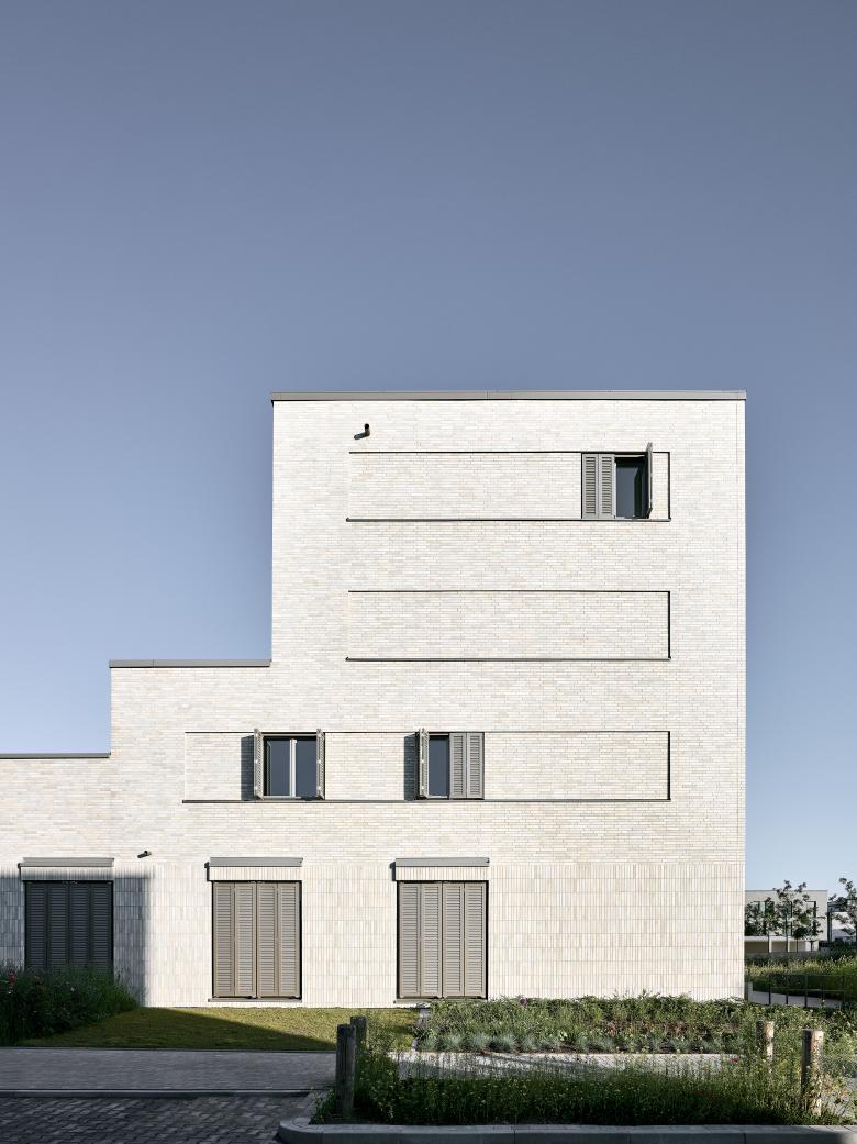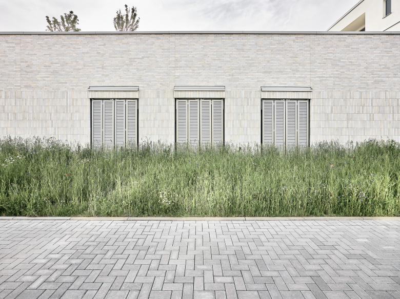 Die oberen Geschosse erhalten einen klassischen Läuferverband und werden durch vertiefte Bänder im Bereich der Fenster und Loggien gegliedert. Als Sonnen- und Sichtschutz dienen Faltläden, welche als Moment der Bewegung in der Statik des Baukörpers ein reizvolles Fassadenspiel erzeugen.