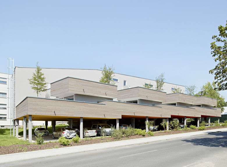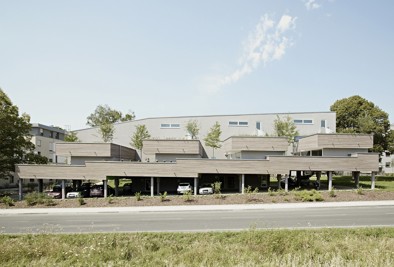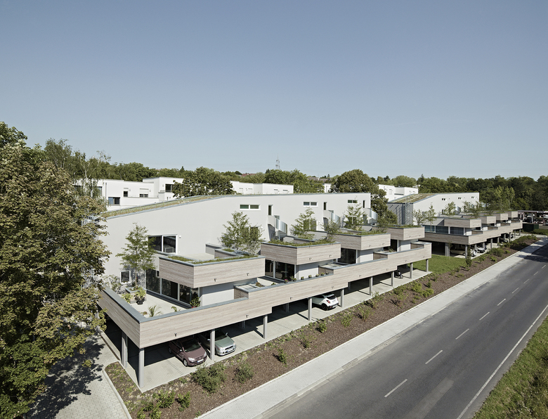 Die Gebäude sind getreppt ausgeführt und passen sich dem natürlichen Gefälle des Geländes an. Dadurch und aufgrund des Verzichts einer Unterkellerung konnten kostenintensive Erdarbeiten auf ein Minimum reduziert werden.