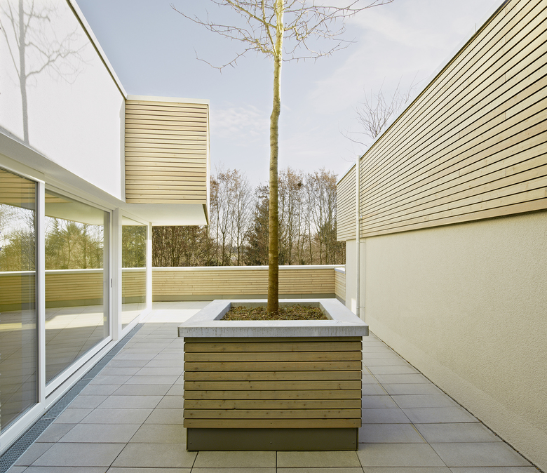 Um ein Wohnen im Grünen mit einer hohen Dichte zu ermöglichen, wurde ein Multifunktionselement entwickelt. Dieses Element wird als tiefe Brüstung ausgeführt, um den Einblick vom Nachbarn zwischen den Geschossen stark zu reduzieren. Des Weiteren dient das Element als Pflanztrog, wodurch auch auf gleicher Ebene ein Sichtschutz generiert werden kann. Zusätzlich übernimmt das Element die Funktion einer Schallschutzwand, wodurch die Gärten als attraktiver Außenraum trotz der relativ stark befahrenen Straße realisiert werden konnten.