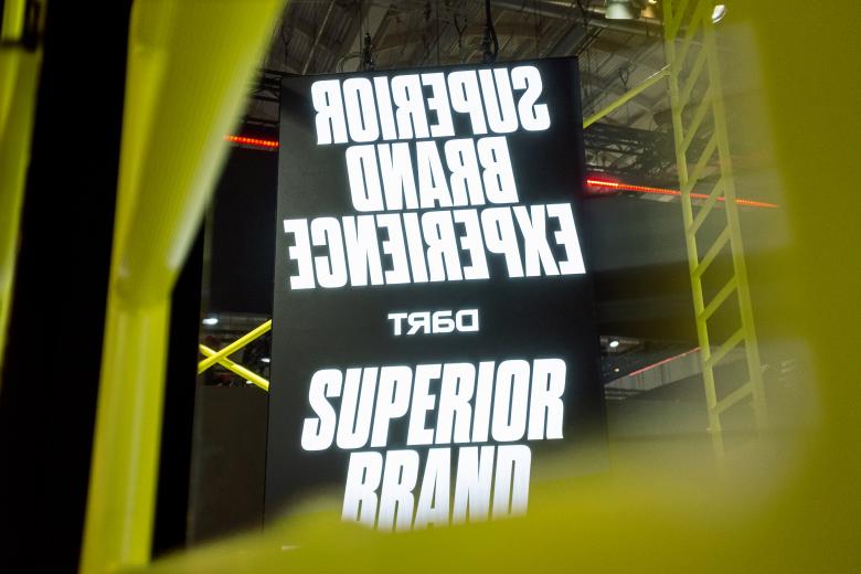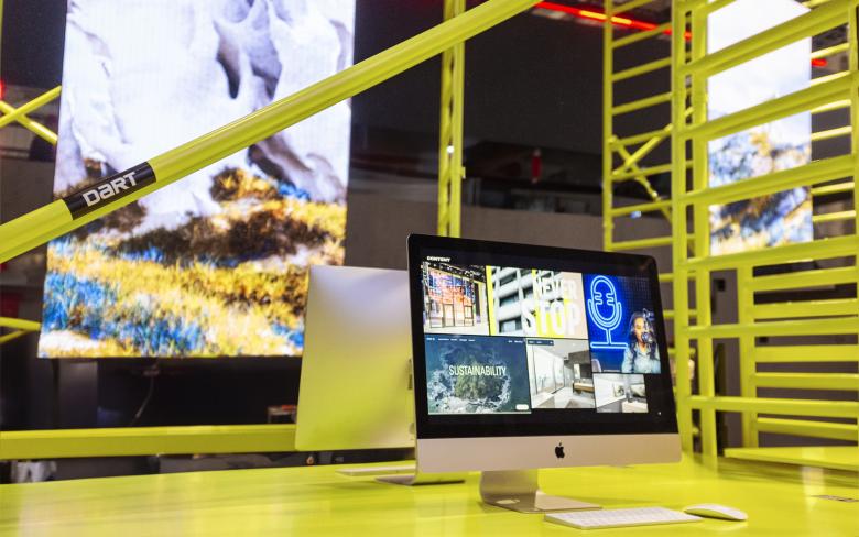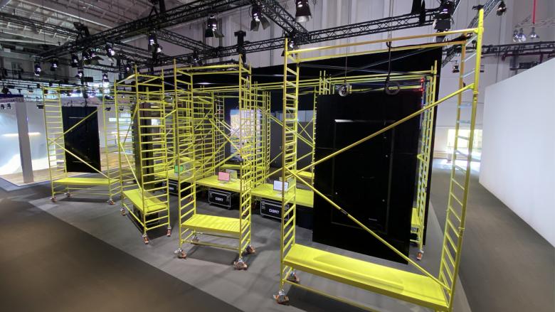 Simpel und stark – wenige Elemente wie neonfarbene Gerüste und LED-Screens prägen das Standdesign. Eine über die Gesamtlänge angebrachte Spiegelwand erscheint erst bei genauerem Hinsehen als vollständige Spiegelung des Stands – insbesondere die gespiegelten Gerüste erzeugen die perfekte Illusion einer Erweiterung des Raumes.