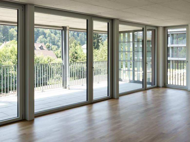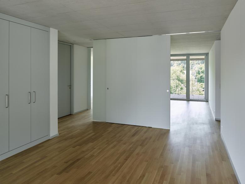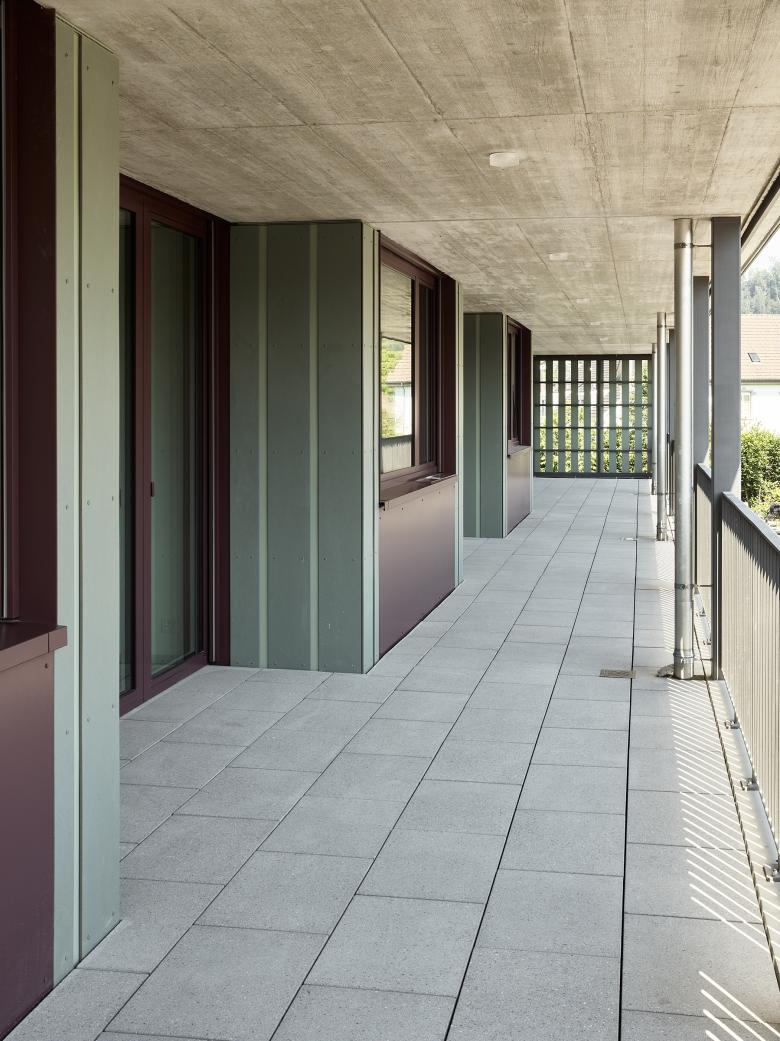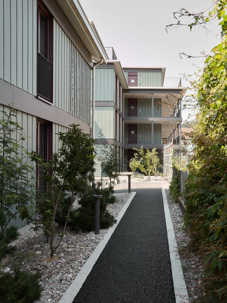 Die beiden zueinander ausgedreht stehenden Baukörper bestehen je aus einem Längsbau und einem dazu versetzten und losgelösten Punktbau. Die Wohnungen werden über Lauben und eine Kaskadentreppe erschlossen. Im Punktbau befinden sich die Familien-, im Längsbau kleineren Wohnungen. Die Baukörper werden durch eine regelmässige Abfolge von Schotten gegliedert, wobei sich über Schaltzimmer unterschiedliche Wohnungskonfigurationen ausbilden lassen. Ein System von Raumkammern und Nischen, von vor- und eingeschobenen Bauteilen sowie im Wohnbereich mittig angeordnete Schiebeelemente erzeugen eine vielseitige erleb- und nutzbare Wohnlandschaft. Gleichzeitig wird über die Anordnung der Individualräume und durch die Schiebeelemente eine Differenzierung der Privatsphäre innerhalb der Wohnung ermöglicht. Der Laubengang wird zum Begegnungs- und Aufenthaltsort, ermöglicht nachbarschaftliche Kontakte und stärkt das Gemeinschaftsgefühl.