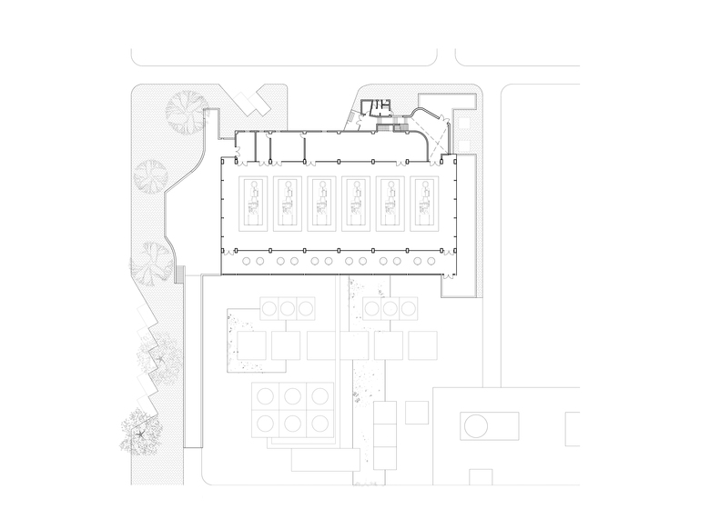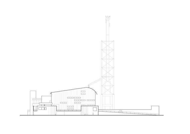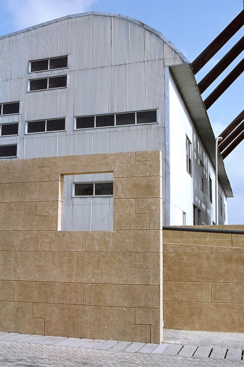 The main generator shed is roofed in a curving sweep making its mass look much lighter. The volume of this block is further broken by pulling out the lowest service level to make a podium. The wall along this podium acts as a skin between building and outside and its sensuous movement acts as a welcoming presence to the plant.