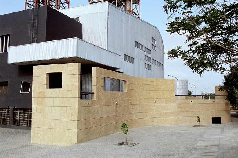 This building, sitting at the entrance of a cement manufacturing plant, has been constructed to house six mammoth diesel generators. The success of this project lies in understanding of the practical & open-ended systems of industrial construction and a creative intervention that makes the building more human – aesthetically and functionally. At the same time the form celebrates the sensorial aspect of the industrial.