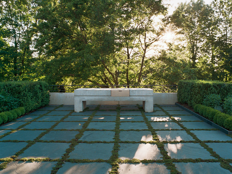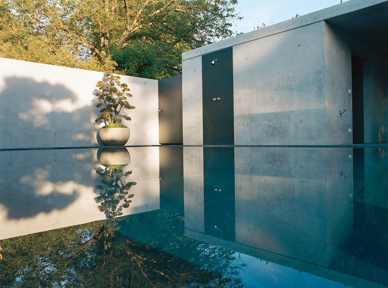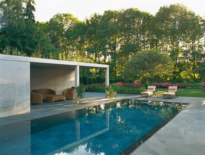 Der kunstvolle Umgang mit der Zurückhaltung, oder: „Weniger ist mehr“. Hauptziel dieser Gestaltung war es, den Kundenwunsch nach „Fläche!“ zu erfüllen. Bestehende Böschungen wurden so weit als möglich begradigt, um innen grosszügige weite Flächen zu erzeugen. Das satte Frischgrün der Rasenfläche harmoniert mit dem blauen Schimmer der Wasserflächen und der schlicht modernen Architektur in einer Spannung, welche weitere Elemente in diesem Bereich überflüssig scheinen lässt. Um die eigenen „Ländereien“ noch zu erweitern, wird durch raffinierte Pflanzmassnahmen am angrenzenden Wald, dieser optisch in den Garten einbezogen und eine unglaubliche Tiefenwirkung erzeugt.