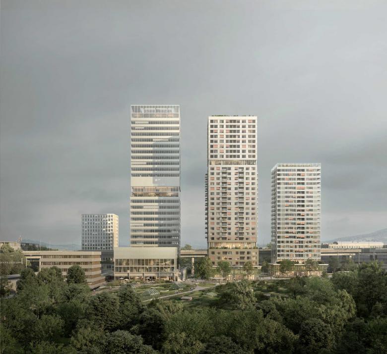 Mit ähnlichen Breiten und Abständen, aber mit gestaffelten Höhen schreiben vier schlanke Hochhäuser –im Kontrast zur horizontalen Struktur der Autobahnbrücke – eine attraktive Skyline in den Himmel. Die Versätze der Hochhäuser in Nord-Süd-Richtung erzeugen Leerräume und ermöglichen Durch- und Weitblicke. Das grossstädtische Hochhaus-Ensemble wird von einer dichten und vielfältigen Natur umgeben.