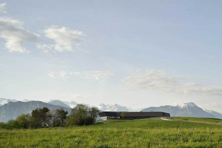 Dem Golfhaus kommt eine grosse Bedeutung in Bezug auf seine Symbolwirkung zu: Einerseits als sportliches Wahrzeichen des Golfplatzes, andererseits soll es dem Aspekt des Landschaftsschutzes, also der gestalterischen Einbindung in die sensible Lage Rechnung tragen. Wir schlagen einen flachen, langgestreckten L-förmigen Holzbau vor, der scheinbar schwebend das neue Gesicht des Golf Meggen bildet. Das Gebäude und die vorhandene Hügelkuppe finden zu einer Symbiose als Teil der neuen Golflandschaft. Diese Geste zeugt von der Demut gegenüber der Landschaft und erreicht eine gekonnte Balance zwischen Einmaligkeit und Diskretion. Der vorfabrizierte Holzkörper des Dachgeschosses mit den Hotelzimmern wird von einer Stützenkonstruktion im Erdgeschoss und der darüberliegenden Betondecke getragen. Das raumhaltige Dach wird mit Kupferplatten verkleidet, die durch Perforationen und Prägungen modifiziert werden. Hexagonale Perforationen zum einen, nach innen und nach aussen gewölbte Prägungen zum anderen, überlagern sich in verschiedenen Rastern. Die Fassade lässt die Aussenhaut des Gebäudes lebendig werden. Hier erscheint sie transparent, dort eher opak. Die Kupferbekleidung wird bewusst wegen der zu erwartenden lebendigen Veränderungen der Oberfläche gewählt.