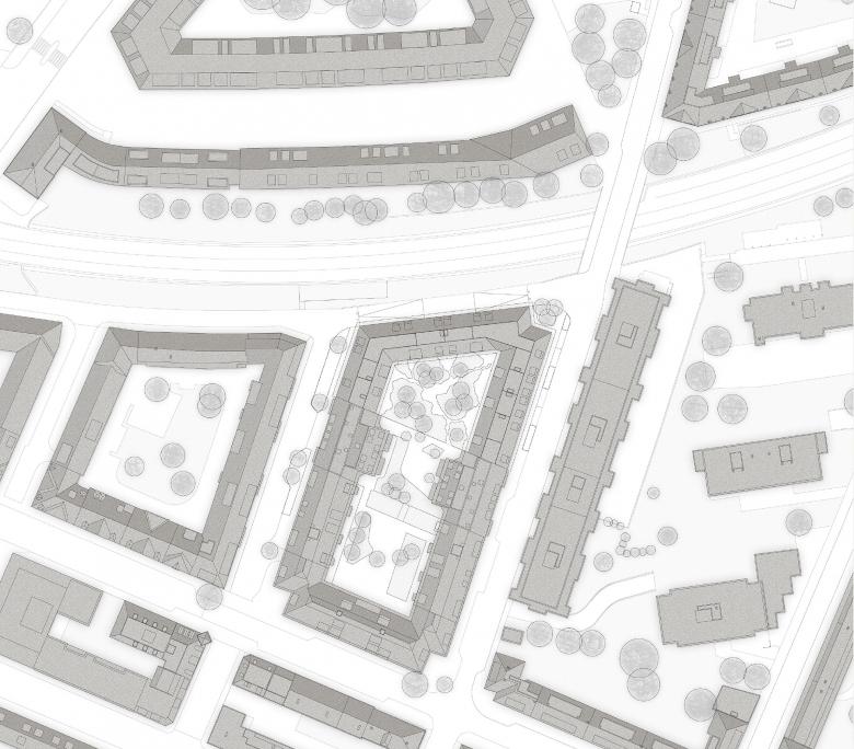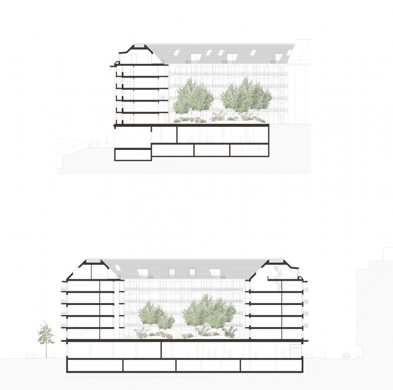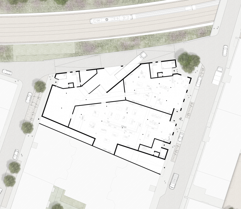 Entsprechend dem bestehenden Gestaltungsplan wird die Blockrandbebauung mit dem neuen Volumen komplettiert. Dieses vermittelt städtebaulich zwischen den angrenzenden historischen Baustrukturen hin zur Pauluskirche, zu seinem neuzeitlichen Gegenüber und zu der strassenbegleitenden Zeilenbebauung aus den 60er-Jahren. Auf der repräsentativeren Strassenseite schafft eine rückspringende Ecksituation im neuen Volumen eine Platzsituation, die den Auftakt des Strassenraumes und die öffentliche Erdgeschossnutzung auszeichnet.
