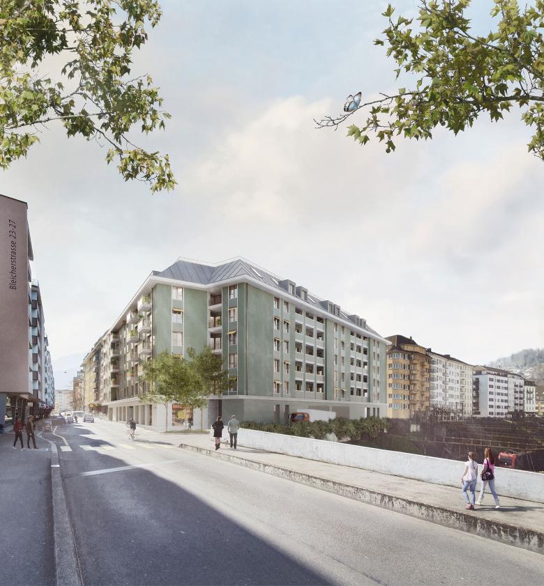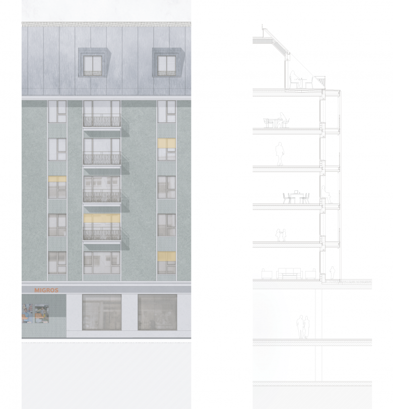 Für das neue Wohn- und Geschäftsgebäude wurde ein Wohnkonzept entworfen, dass dem Bewohner sowohl gesellschaftliche Komponente bietet aber auch dem Wunsch nach Privatsphäre und Individualisierung Rechnung trägt. Die geschickte Integration von gesellschaftlichen Elementen wird in der Wohnungserschliessung und den Aussenräumen auf vielfältige Art und Weise zum Thema gemacht. Typologisch sind die Wohnungen über eine Laube erschlossen und folgen dem Prinzip des Durchwohnens. Die privaten Aussenräume auf der Laube können mit Vorhängen zoniert werden, sind gleichzeitig Sonnen- und auch Sichtschutz und beleben die Hoffassaden mit einem Farbenspiel. Die dem Projekt zugrundeliegende Typologie schafft eine urbane Dichte und eine gelebte Nachbarschaft. Im Ausdruck orientiert sich das Projekt an den klassischen Konventionen der Blockrandbebauung. Die Fassade gegen aussen ist repräsentativ und gegen den Innenhof wohnlich gestaltet. Diese Unterschiedlichkeit der beiden Welten wird im Projekt durch den durchgrünten naturnah gestalteten Innenhof gestärkt.