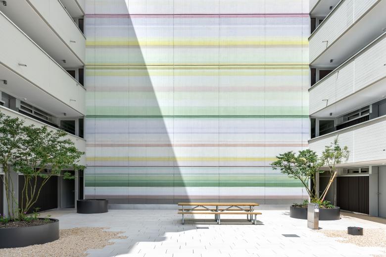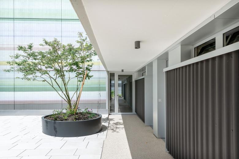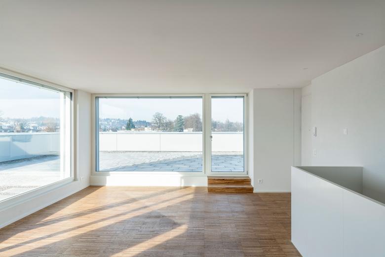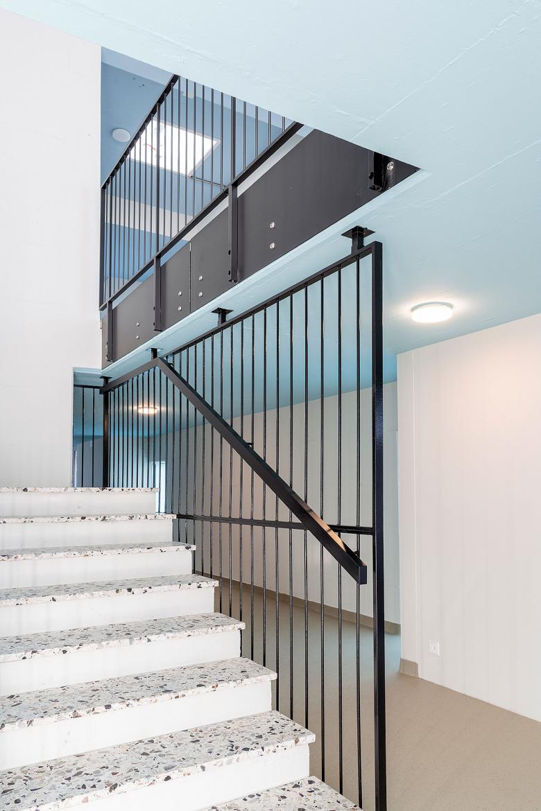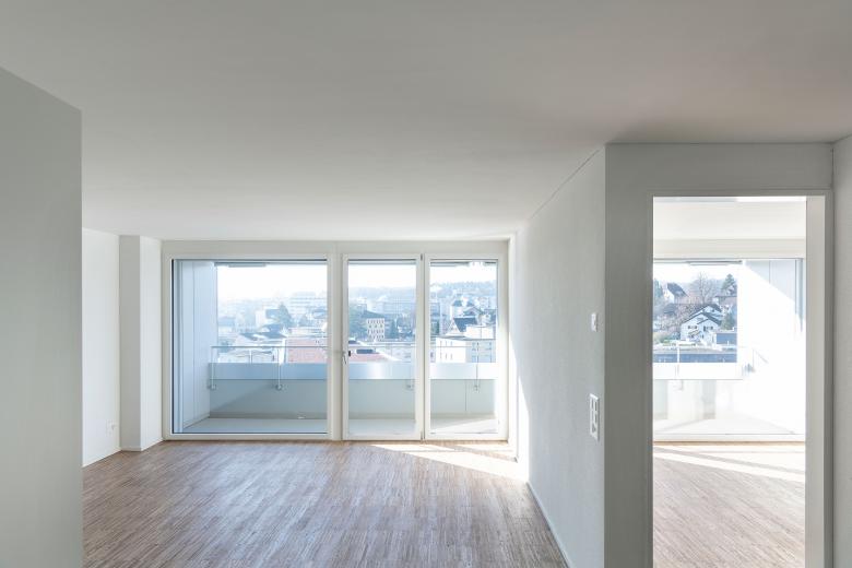 Für die Gesamtsanierung der beiden Wohngebäude aus dem Jahre 1974 wurde aus statischen Gründen ein Rückbau bis auf die primäre Betonskelettstruktur notwendig. Neue Raumstrukturen sorgen dafür, dass die Wohnungs- und Zimmergrössen sowie Küchen und Nasszellen wieder den heutigen Bedürfnissen entsprechen. Die gesamte Gebäudetechnik wurde ersetzt und eine komplett neue Gebäudehülle mit Fassadenphotovoltaik installiert. Durch die umfassende Gesamtsanierung kann der einprägsame Bau an ortsbaulich prägnanter Lage wieder seine volle Wirkung entfalten. Der bedachte Umgang mit den vorhandenen, noch intakten Elementen der Primärstruktur zeugt von einer nachhaltigen und ressourcenschonenden Bauweise.