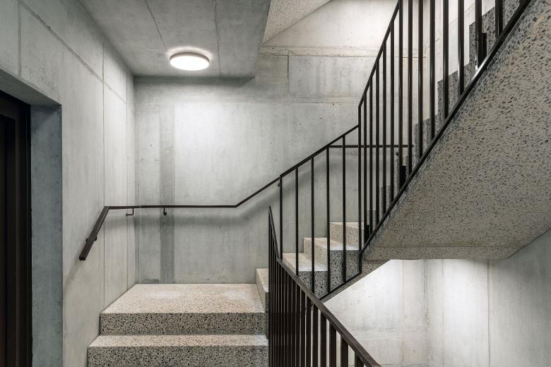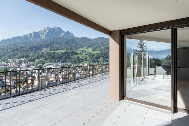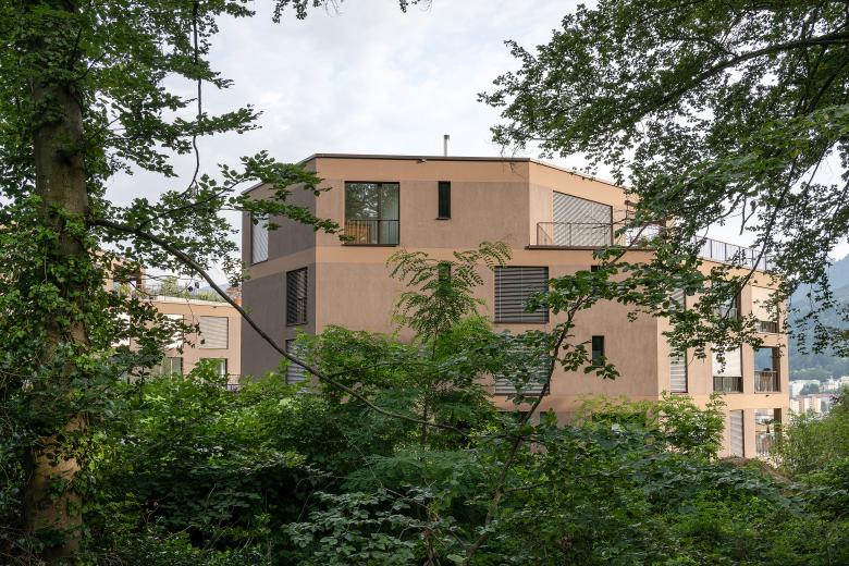 Die neuen Bauten sollten mit grösstmöglichem Respekt und unter Wahrung des öffentlichen Erholungs-, Begegnungs- und Aussichtsraumes in den sensiblen Naturraum Stirnrüti integriert werden. Durch eine dichtere Anordnung der Volumen entlang der Hangkante kann die Hügelkuppe vollständig von Bauten freigehalten werden. Der spürbare Gegensatz von verdichtetem Siedlungsbereich und weitläufigem, öffentlichem Naturraum verleiht dem Eingriff eine Klarheit und räumliche Spannung. Dadurch gewinnt einerseits die Siedlung an Identität mit klarer Adressbildung, andererseits bleibt die schützenswerte Naturlandschaft intakt und wird als Aufenthaltsraum im Übergang von Siedlung zum Bireggwald räumlich gestärkt. Die Sichtbezüge auf Landschaft und Pilatus bleiben erhalten. Die bauliche Intervention in die Landschaft ist klar und eindeutig, mit wenigen Bauten und effizientem, einfach in die Topografie gelegtem Untergeschoss kann die Wirtschaftlichkeit gesteigert werden. Als gegenüber zum Rande des Bireggwaldes definiert die neue Gesamtvolumetrie städtebaulich einen feingliederigen aber klaren Abschluss des Siedlungsgebietes. Die einzelnen Gebäudevolumen scheinen spielerisch geformt, sind aber präzise aufgrund der An- und Aussicht entwickelt. Die Formen schmiegen sich um die Hangkante, verschmelzen mit ihr und muten organisch an, direkt aus der Nachbarschaft des angrenzenden Waldes gewachsen. Durch die Höhenrückstaffelungen im ersten Ober- bzw. Attikageschoss und dem mehrfachen Knicken der Fassaden ordnen sich die Volumen, trotz beträchtlicher Ausmasse zurückhaltend in die Massstäblichkeit des Ortes ein. Die entstehenden Dachflächen bilden Terrassen auf unterschiedlichen Niveaus.