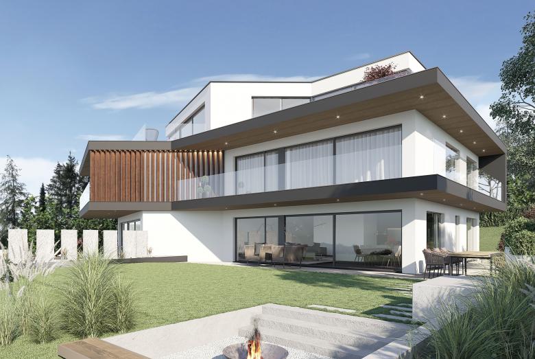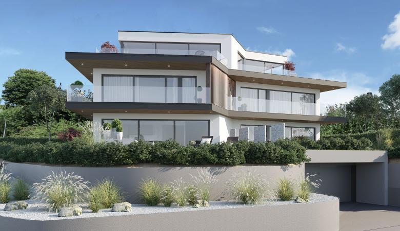 Die beiden 6 ½ Zimmer-Häuser fügen sich zu einem dynamischen und filigranen Baukörper zusammen und orientieren sich in unterschiedliche Richtungen.
