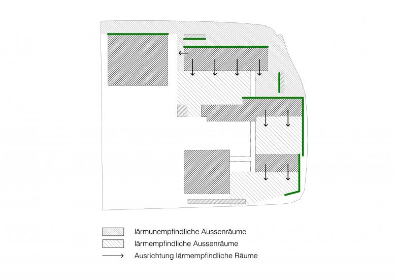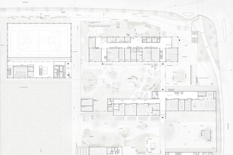 Ausgehend von der Grundrisstypologie der Bestandesbauten erhält die Schulanlage mit einem gegenüber der Kreuzung zurückversetzen zweigeschossigen Volumen einen adäquaten Abschluss.
