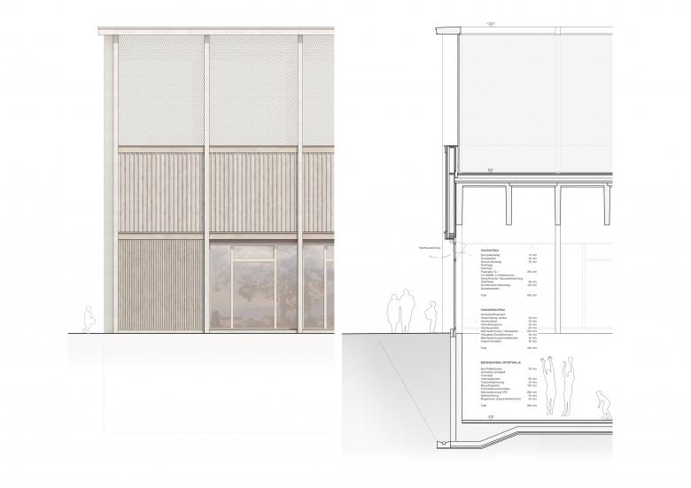 Die Doppelsporthalle schafft als selbstbewusstes Gebäudevolumen den Abschluss nach Nordwesten. Sowohl von der Autobahn als auch von der Innenstadt her kommend erhält die Doppelsporthalle mit ihrer öffentlichen Nutzung (Allwetterplatz / Sportanlässe) die ihr gebührende stadträumliche Präsenz.