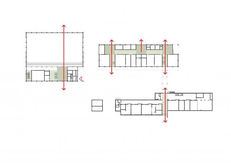 Durch den dezidierten Versatz zu den beiden in einander verschränkten Zeilen im Süden schafft die zeilenförmige Schulerweiterung städtebaulich eine einladende Geste.