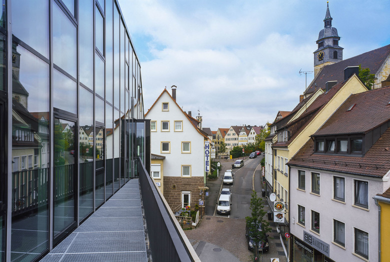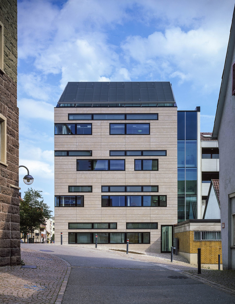 Aufgrund der besonderen Lage und der Ecksituation orientiert sich der Neubau an den bestehenden Nachbargebäuden in der Höhenentwicklung und fügt sich so selbstverständlich ein. Formal wurde aus der Grundfigur eines Quaders Teilstücke entnommen, die Bezüge zu der umgebenden Bebauung entwickeln. Die eingeschnittenen Flächen sind transparent, die ursprünglichen Außenflächen wirken massiv und sind einheitlich mit Naturstein verkleidet. Das Konzept der Einschnitte in einen geometrischen Körper wurde bis ins Detail konsequent umgesetzt.