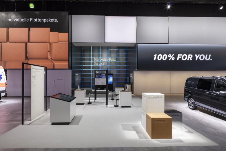 Der räumliche Abschluss der Ausstellung bildet die ca. 8.00 hohe Markenwand, welche auf einer Höhe von +2,60 zweigeteilt ist. Die Teilung der Rückwand und die damit verbundene Ausbildung einer um zwei Meter rückgesetzten Nische, schafft gezielte Bereiche für Nahkommunikation, bildet visuelle Bezüge zu Cateringbereiche und liefert einen räumlichen Zusammenhang über die jeweiligen Marken hinweg. Die Markenwand selbst nimmt Medienflächen, wie auch Leuchtkästen auf. Diese dienen der jeweiligen Kommunikation der Marke. Durch Ausbildung von Nischen in der Markenwand werden für Themen wie Fleetboard, Actros Highlight, Powertrain, MB Pro, eConsulting und Digital Services/Omniplus Bereiche geschaffen, die sowohl Teil der gesamten Ausstellung sind, aber auch als einzelne Bereiche, räumlich getrennt wahrgenommen werden.