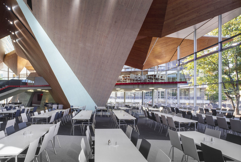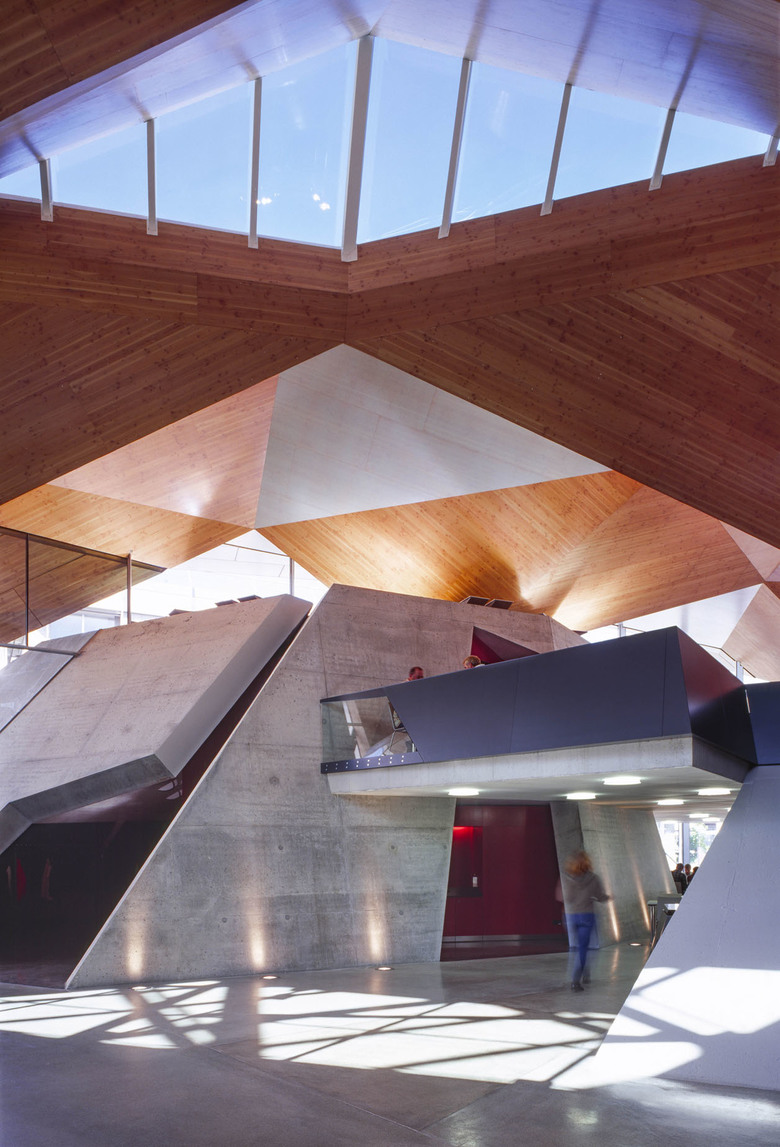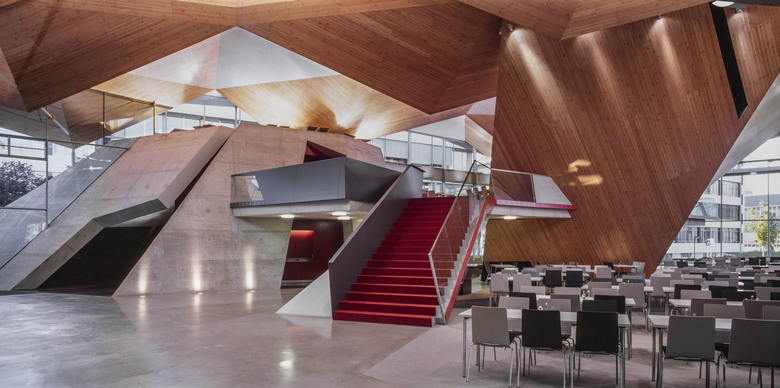 Der Gastraum – Unter einer bewegten großflächigen hölzernen Dachlandschaft nehmen täglich ca. 2.200 Mitarbeiter auf 680 Sitzplätzen ein Mittagessen ein. Formal gestaltete steinerne Volumen tragen das Dach und beinhalten die Infrastruktur für den Gastraum. Das Dachtragwerk über dem Gastraum tritt in seinen statischen Details nicht in Erscheinung: Vielmehr überspannt ein räumliches, hölzernes „Faltwerk„ scheinbar stützenfrei den großen Gastraum und leistet gleichzeitig die signifikanten Auskragungen, welche jeweils die Logik dieser Form zu Ende führen. Die in Beton materialisierten Volumen wachsen nach oben (Stalagmiten) und die hölzern ausgebildeten Elemente der Dachlandschaft wachsen nach unten (Stalaktiten) und gliedern so gemeinsam den großzügigen, fließenden Gastraum in unterschiedliche Teilbereiche.