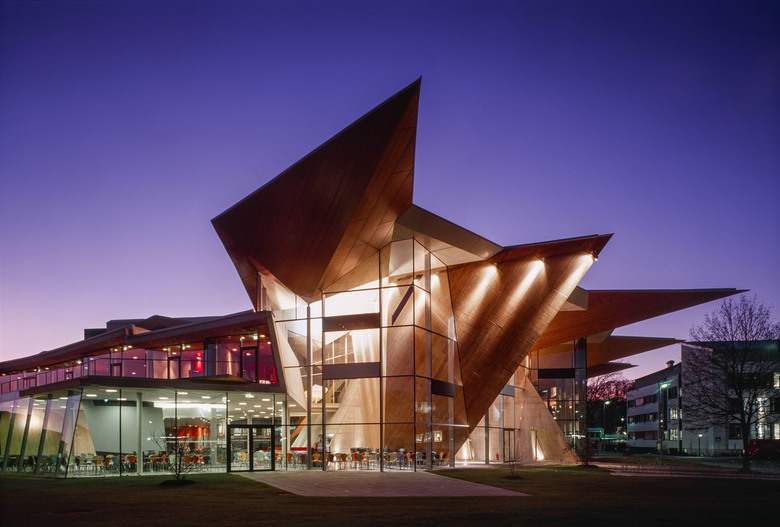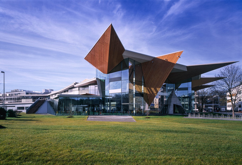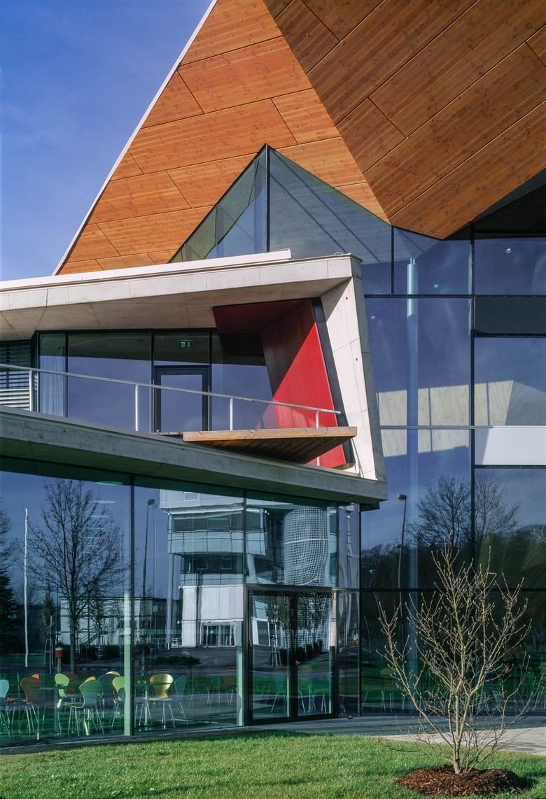 Das neue Restaurant vermittelt mit seiner moderaten Höhe zwischen dem kleinen Wohngebiet und der dahinterliegenden, mehrgeschossigen Institutsbebauung. Es befindet sich aber auch in der Nähe zum Nordtor, einem der beiden Zugänge zum Werksgelände. Die solitäre Figur des Mitarbeiterrestaurants findet sicheren Platz auf dem dreieckförmigen Grundstück, die Außenanlagen beziehen mit weitem Umgriff die Umgebung mit ein und sorgen so für die notwendige Freiheit des solitären Gebäudes. Eine geschosshohe Verglasung schafft fließende Übergänge zwischen innen und außen und lässt so den Gastraum an der gewonnenen Großzügigkeit teilhaben.