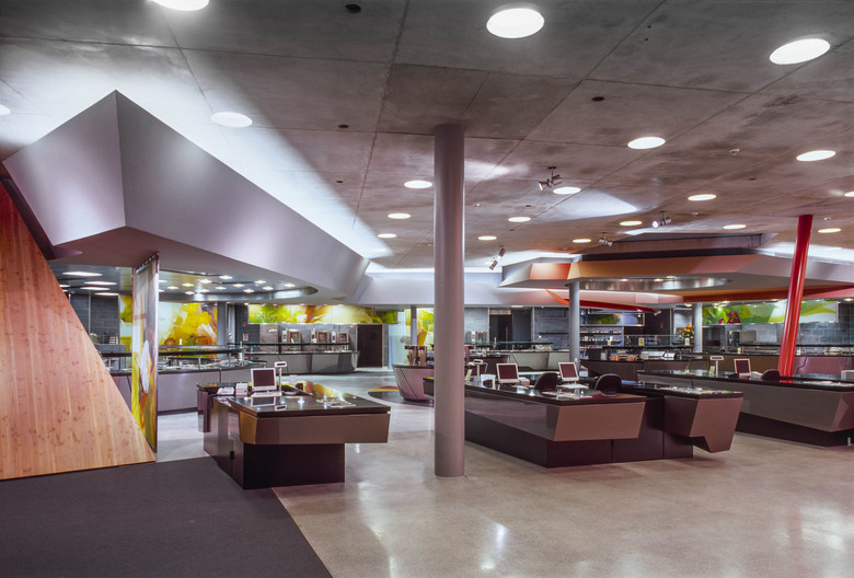 An sieben runden Ausgabestationen werden unterschiedliche Gerichte in einem Marktbereich angeboten. Die Ausgabetheken mit gezielten Luftabsaugungen etc. sind technisch hochbelastete Bauteile. Die Bauteile sind jedoch so bearbeitet, dass keine Zwänge spürbar werden: Scheinbar spielerisch verteilen die Köche hinter möbelhaft designten Theken aus Naturstein und Edelstahl ihre jeweils frisch zubereiteten Gerichte. Der Küchenbereich im traditionellen Sinne beschränkt sich auf wenige Räume für die Nahrungsmittelvorbereitung und das automatisierte Geschirrspülen. Diese sind, gemeinsam mit Kühl- und Lagerräumen, den Mitarbeiteraufenthalts- und Umkleidebereichen sowie der Anlieferung mit Büroeinheiten in einer orthogonalen, effizienten Struktur angeordnet: Zwei parallele Flure erschließen getrennt die Einrichtungen der Versorgung und die Einrichtungen der Entsorgung.