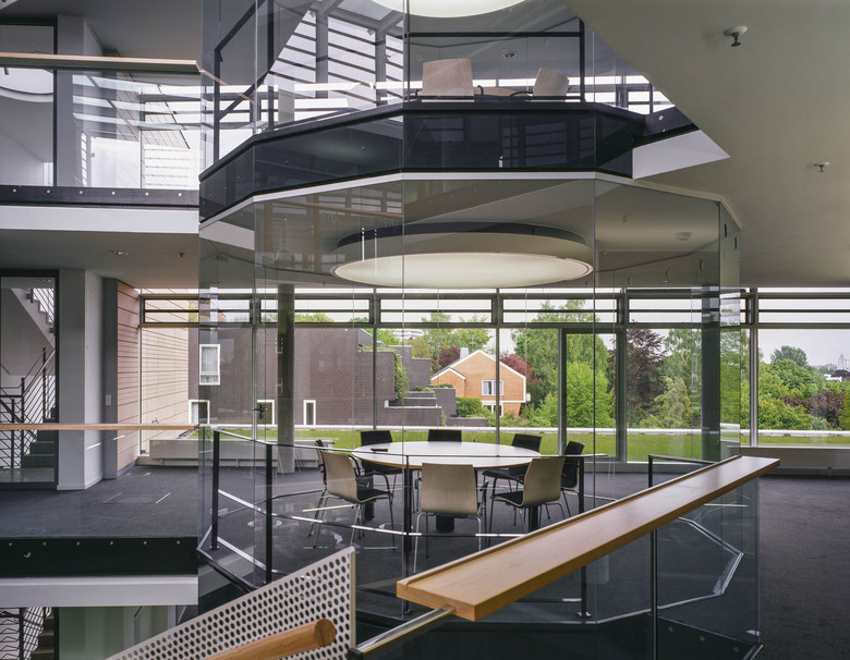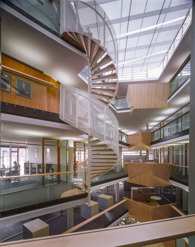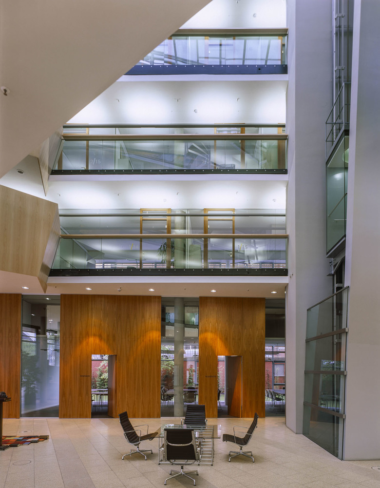 Das Atrium – Neben der signifikanten äußeren Gestalt bietet das Gebäude im Innern, durch seinen fünfgeschossigen Luftraum eine tagesbelichtete Kommunikations- und Erschließungszone mit Glasaufzug und eingehängten Spindeltreppen zur Kurzerschließung. Die angrenzenden Büros sind zum Luftraum mittels Glastrennwänden akustisch abgeschottet. Die verspringenden Galeriekanten ermöglichen offene Besprechungszonen und repräsentieren das offene und transparente Beratungskonzept.