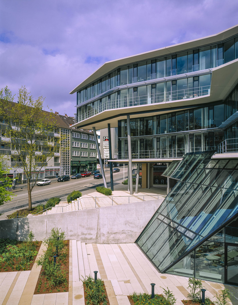 Lage – Das Grundstück selbst befindet sich an der Nahtstelle zwischen den villen-artigen Solitärbauten im Süden und einer städtischen Blockrandstruktur im Norden und Westen. Hieraus erklärt sich die unterschiedliche Gebäude-Geometrie, mit den eher geschlossenen Fassaden zu den angrenzenden Gebäuden und der maximal verglasten und freischwingenden Fassade nach Süden, hin zum Kleinen Kiel. Nach Süden zur Stadt, öffnet sich das Gebäude, bildet mit der großzügigen Treppenanlage einen angemessenen Eingangsbereich und Anschluss an die ansteigende Bergstraße. Die Hangsituation macht es möglich, drei Geschosse quasi unter Erdgleiche zu verbergen. Dort befinden sich Tiefgarage, Archive und Nebenräume.