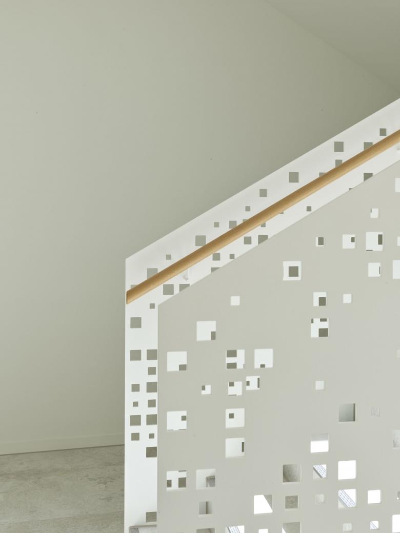 Im überschiebenden Bereich der beiden langgestreckten Baukörper und im Zentrum des neuen Gebäudes befindet sich die Eingangssituation mit Foyer, Wartebereich und Information. Die Besprechungsräume im EG und OG sind so angeordnet, dass sie zu den Foyerflächen zugeschaltet werden können und damit größere zusammenhängende Flächen für Empfänge oder kleinere Ausstellungen und Veranstaltungen entstehen.