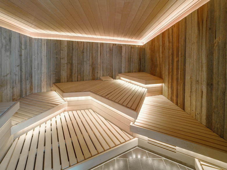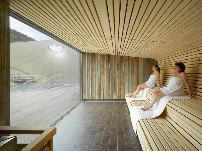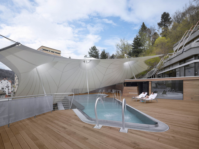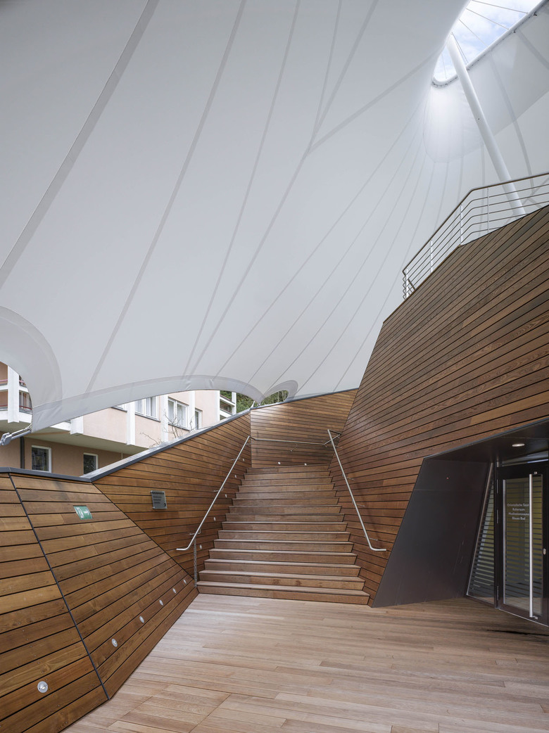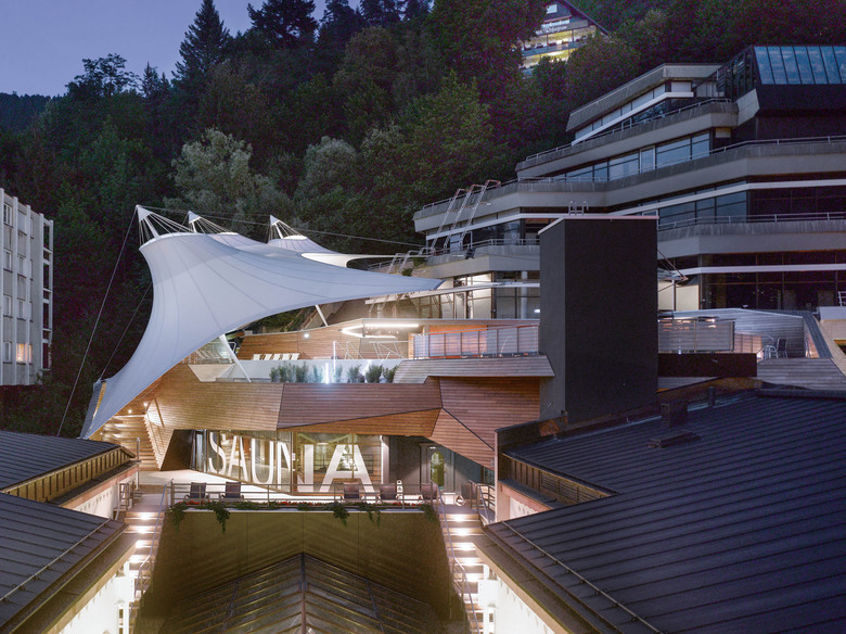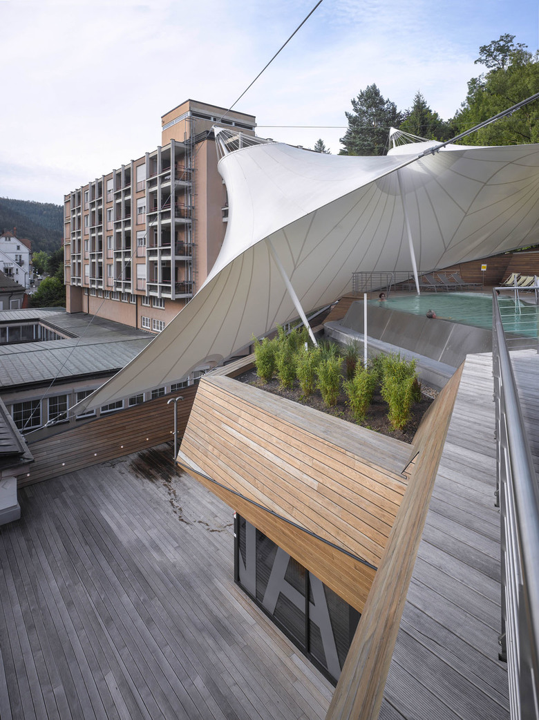 Um Einblicken des benachbarten Thermenhotels vorzubeugen, spannt sich über die gesamte Nordseite eine signifikante und leichte Membrankonstruktion. Die lichtdurchlässige weiße Membranfläche rahmt einerseits den Blick nach Süden und Osten und schafft andererseits auch Witterungsschutz auf weiten Bereichen der Holzdecks. Zusätzlich wirkt die segelgleiche temporäre Installation, die abends auch beleuchtet erscheint, atmosphärisch und ist durch das Zusammenspiel mit den Holzflächen von allen Seiten aus weithin sichtbar.