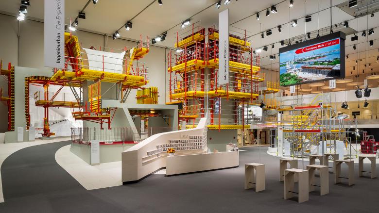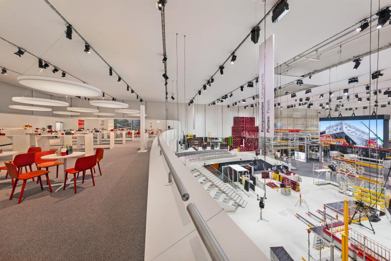 Die Ausstellung wird durch einen ovalen Luftraum geprägt, welcher von Rampe, Tribüne und Freitreppe gerahmt ist und einen zentralen Markplatz als Showfläche ausbildet.Der Marktplatz gliedert sich in vier Bereiche entsprechend den Sparten von PERI. Im östlichen Doppelstock befinden sich eine Installationsspange, Technikräume und Lager. Der westliche Bereich hingegen ist für die Exponate reserviert, welche für eine bessere Übersichtlichkeit zur Fassade hin höhentechnisch abgestuft sind.