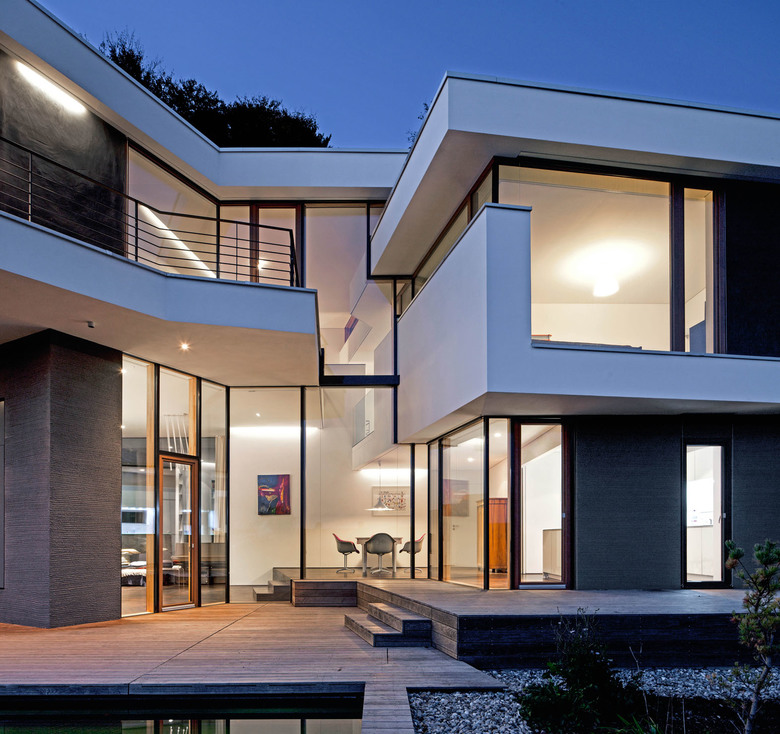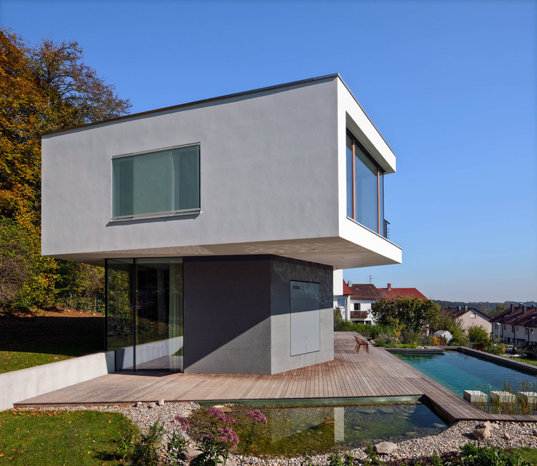 Lage und Ort – Das Grundstück auf einer ehemaligen Obstwiese im Nordwesten von Ulm liegt attraktiv und naturnah. Die besondere Lage wird im Wesentlichen durch den Südhang, den angrenzenden dichten Waldbestand im Norden und einen großzügigen unbebauten Grünzug im Westen charakterisiert. Die nachbarschaftliche Bebauung hat ausreichend Abstand und es bietet sich ein weiter Blick über die Ulmer Innenstadt mit dem Münster im Südosten. Aus der vorhandenen Situation heraus erfolgt die funktionale Aufteilung und die formale Ausprägung des Hauses: Über einem offenen Sockelgeschoss mit weitestgehender Transparenz zu Garten und umgebender Natur liegt ein zeichenhafter Baukörper aus zwei zur Seite geschlossenen Spangen. Entsprechend sind die Funktionen des Hauses gegliedert: Auf unterschiedliche Höhen verteilt staffeln sich von unten nach oben Wohnen, Essen, Kinder- und Elternbereich mit ständigem Bezug zur gemeinsamen Mitte und großzügigem Luftraum.