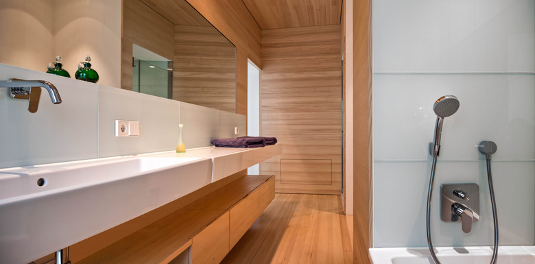 Die Materialität ist auf Glas, Putzflächen und ein Räuchereichenparkett reduziert. Der einheitliche Bodenbelag im gesamten Haus unterstreicht die fließenden Übergänge bis in den Außenbereich und schafft einen großzügigen Gesamteindruck.