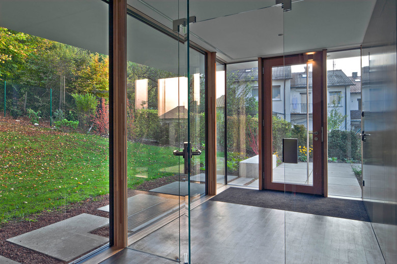Entwurf und Funktion – Fußläufig wird das Haus über einen schon vorhandenen seitlichen Weg erschlossen. Mit dem Pkw bietet sich eine unterirdische Zufahrt über einen Tunnel in die Parkgarage im Kellergeschoss des Hauses.