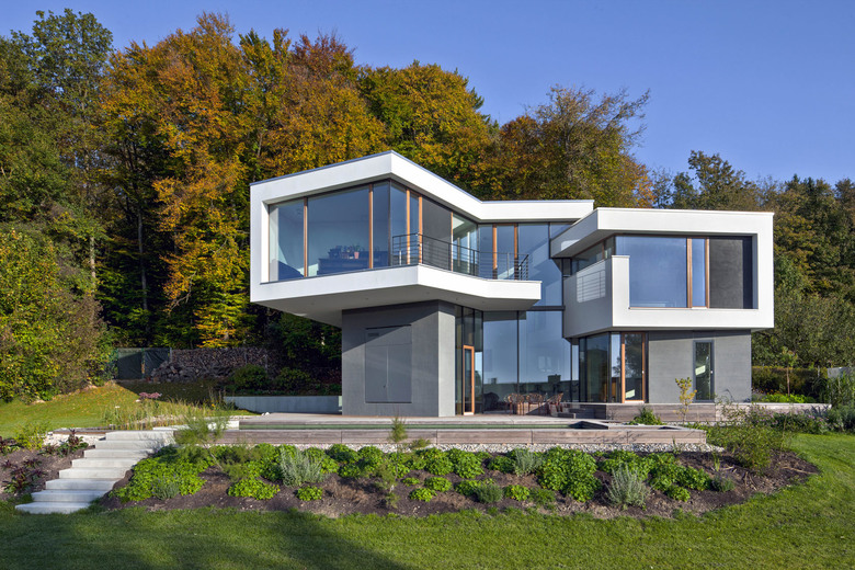 Materialität – Das gesamte Haus besteht aufgrund der Auskragungen und der stützenfreien Ausführung fast ausschließlich aus Stahlbeton mit 120 mm Außendämmung und Putzoberfläche (Wärmedämmverbundsystem).