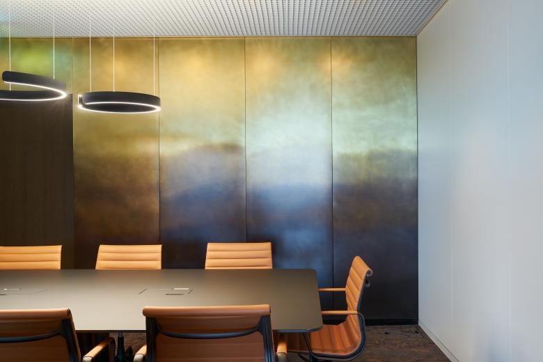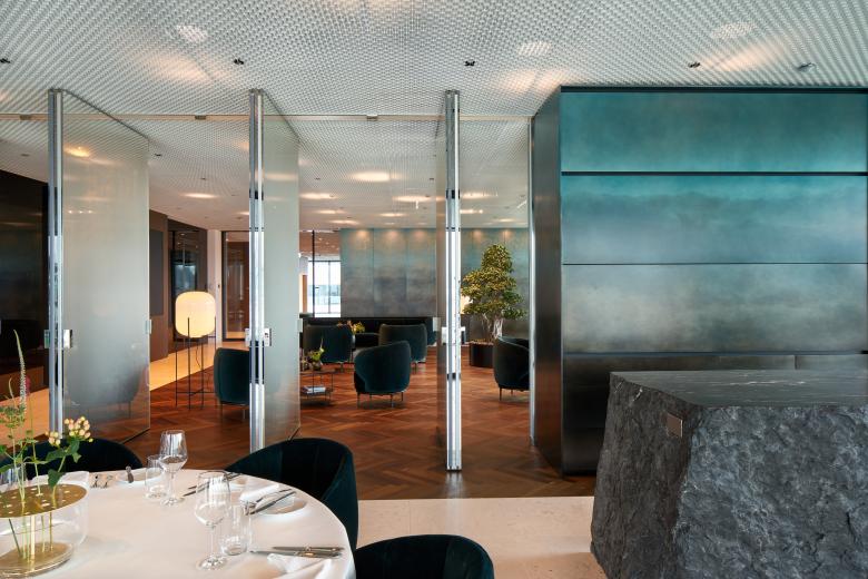 Materialien wie warmgewalzter Stahl, Naturstein, Glas und Holz geben dem Raum eine ganz eigenständige Atmosphäre und erfüllen die hohen Ansprüche an Qualität, Langlebigkeit und Schweizer Tradition. Die «Sky Lounge» besticht nicht nur durch