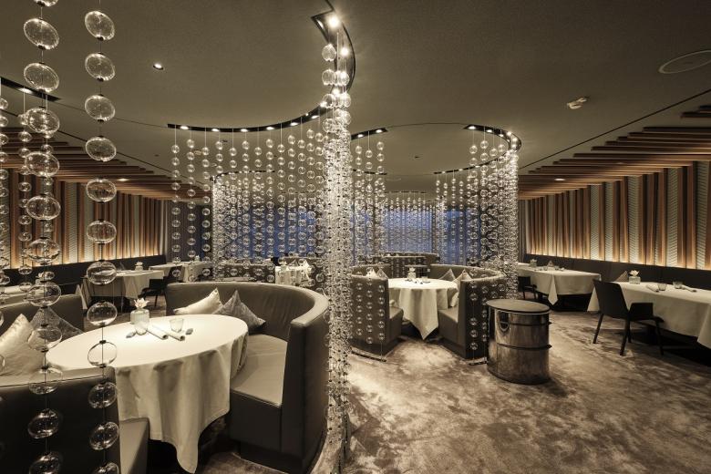 Geheimnisvoll und dunkel gibt sich das Restaurant ÖSCH NOIR. Hier können französische Spezialitäten genossen werden. In dem seit Frühjahr 2021 mit einem 2. Michelin Stern ausgezeichneten Gourmet Restaurant wurden die Schlitzdurchlässe INDUL geschickt am Übergang zweier unterschiedlicher Deckenbereiche installiert. Im Ergebnis optisch zurückhaltet und dezent - jedoch mit einer optimalen lufttechnischen Wirkung mittig im Raum. Die in den Deckenrandbereichen aufgesetzten Holzelemente gehen in die Wandverkleidung über und ergänzen das edle Ambiente um eine leichte rustikale Note. Als elegante Raumteiler rund um die Tische dienen abgehängte Glaskugeln, die im ganzen Raum stilvolle Lichteffekte entstehen lassen.