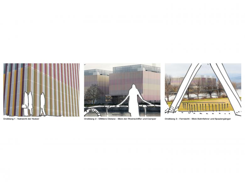 Die Fassadengestaltung ist für die Fernwirkung konzipiert. Der Betrachter sieht in der Ferne drei geometrisch klare Volumen, die über ihre subtile, dezent changierende Vielfarbigkeit einen Maßstab erhalten (ablesbare Geschosse) und sich differenziert in die Landschaft/Industrielandschaft einfügen. Ein malerischer und skulpturaler Dreiklang aus Mischfarben, deren Gebäude untereinander und mit ihrer Umgebung kommunizieren.