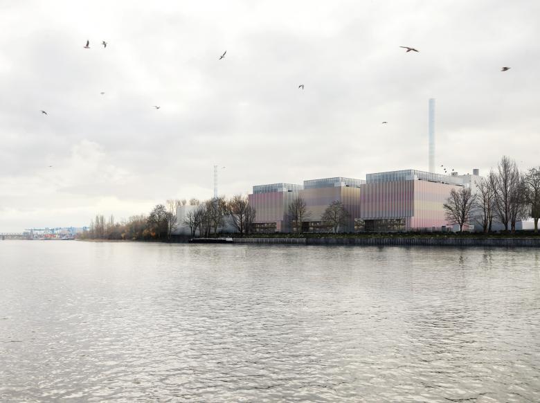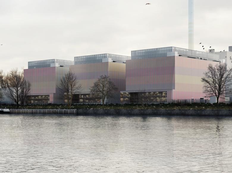 Ein raffiniertes Prinzip aus gegeneinander versetzten farbigen Metallstreifen führt zu einem besonders spannungs- und qualitätsvollen Gestaltungskonzept. Durch die changierende Farbmischung fügen sich die drei großvolumigen Blöcke des Rechenzentrums in der Fernwirkung harmonisch in den Landschaftsraum ein, ohne die technisch-industrielle Nutzung des Gebäudes zu negieren. Auch auf das Farbkonzept der übrigen Kraftwerksgebäude nimmt der Entwurf auf überzeugende Weise Bezug, ohne sich diesem anzubiedern oder unterzuordnen. Geschickt gewählte Versätze zwischen den Farbstreifen gliedern die Volumina horizontal wie vertikal und verleihen den Baukörpern eine differenzierte Maßstäblichkeit. Bei einer Annäherung an die Gebäude entstehen durch die stärkere Wahrnehmung der einzelnen farbigen Elemente sich verändernde Eindrücke und Mischungen. Hierdurch erhält das Konzept eine zusätzliche Tiefe und Qualität. Die Umsetzung mit Hilfe eines marktgängigen Fassadensystems verspricht eine einfache und wirtschaftliche Realisierung innerhalb des vorgegebenen Kostenrahmens. Zugleich werden mit einer zu erwartenden Wartungsarmut und Dauerhaftigkeit wesentliche Kriterien der Nachhaltigkeit erfüllt. Bei der Erstellung der Fassaden soll Sekundäraluminium Verwendung finden. Am Ende des Lebenszyklus ist eine sortenreine Demontage auf einfache Weise möglich. (…)