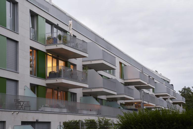 Der Gebäuderiegel mit der hochwertigen Natursteinfassade erstreckt sich über 5 Ober- und ein Untergeschoss und beherbergt 44 Eigentumswohnungen.