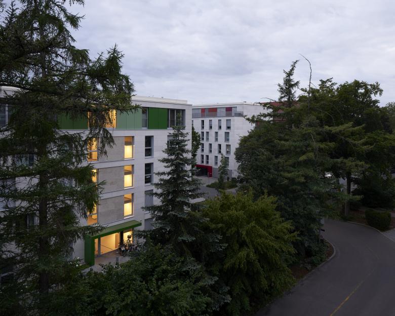 Dieser Neubau orientiert sich in Material und Kubatur an Haus A. Während Haus A jedoch durch rote Paneele strukturiert wird, besitzt das jüngere Gebäude Fassadenpaneele in verschiedenen Grüntönen. Und auch die skulpturale Ausformung und die Rücksprünge in der Fassade entsprechen sich.