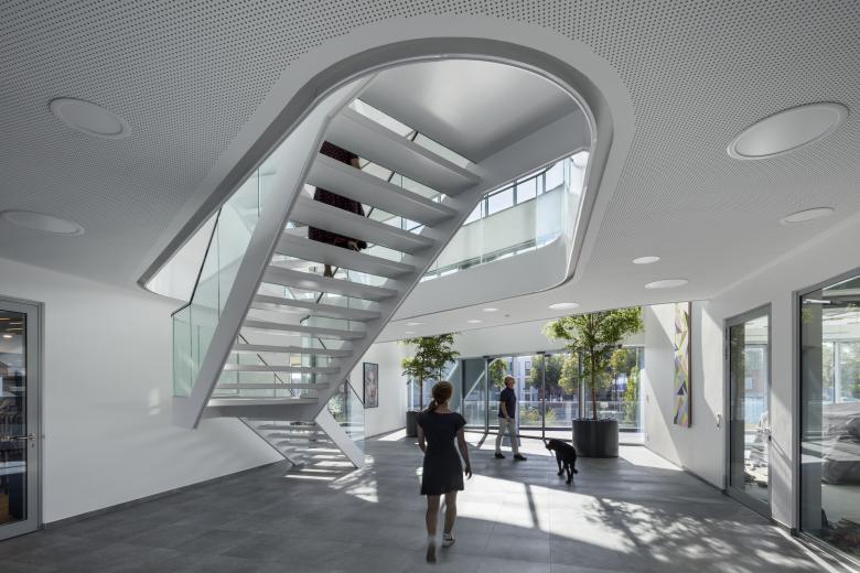 Auch im Inneren, besonders im begrünten Atrium, das sich über alle 4 Geschosse erstreckt, und durch das ein großzügiges Treppenhaus führt, erscheint das Haus mit seinen vielen Aus- und Durchblicken sehr hell und transparent.