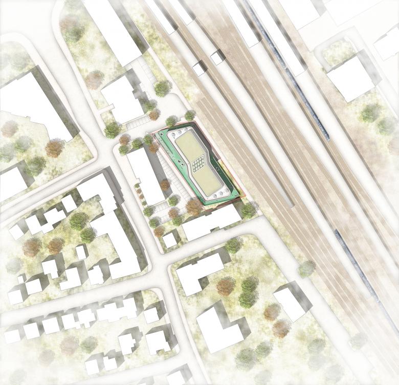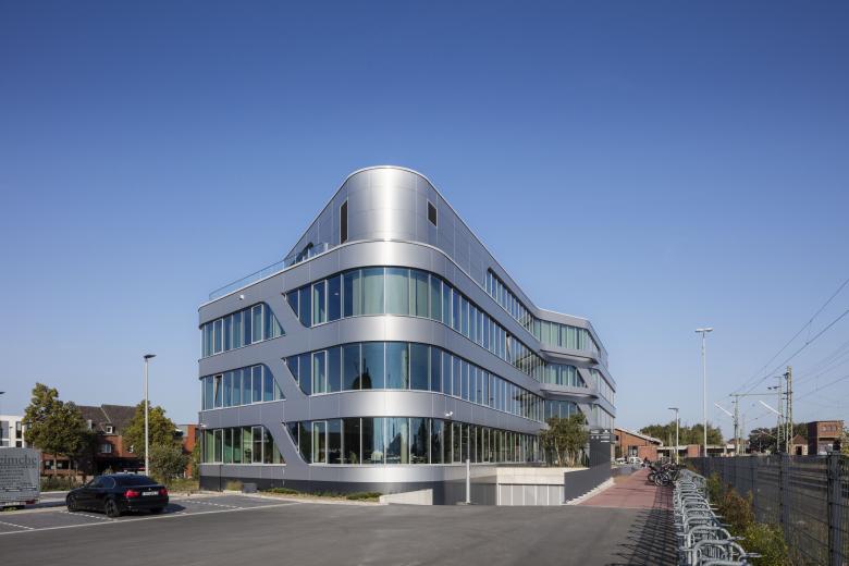 Der Neubau nimmt mit seiner länglichen Form und den abgewinkelten Seiten die städtebaulichen Fluchtkanten auf – allen voran den Verlauf der Bahntrasse – und schafft durch den Versatz im Gebäude einen architektonischen Bezug zum bereits 2013 errichteten Franz-Tacke-Haus.